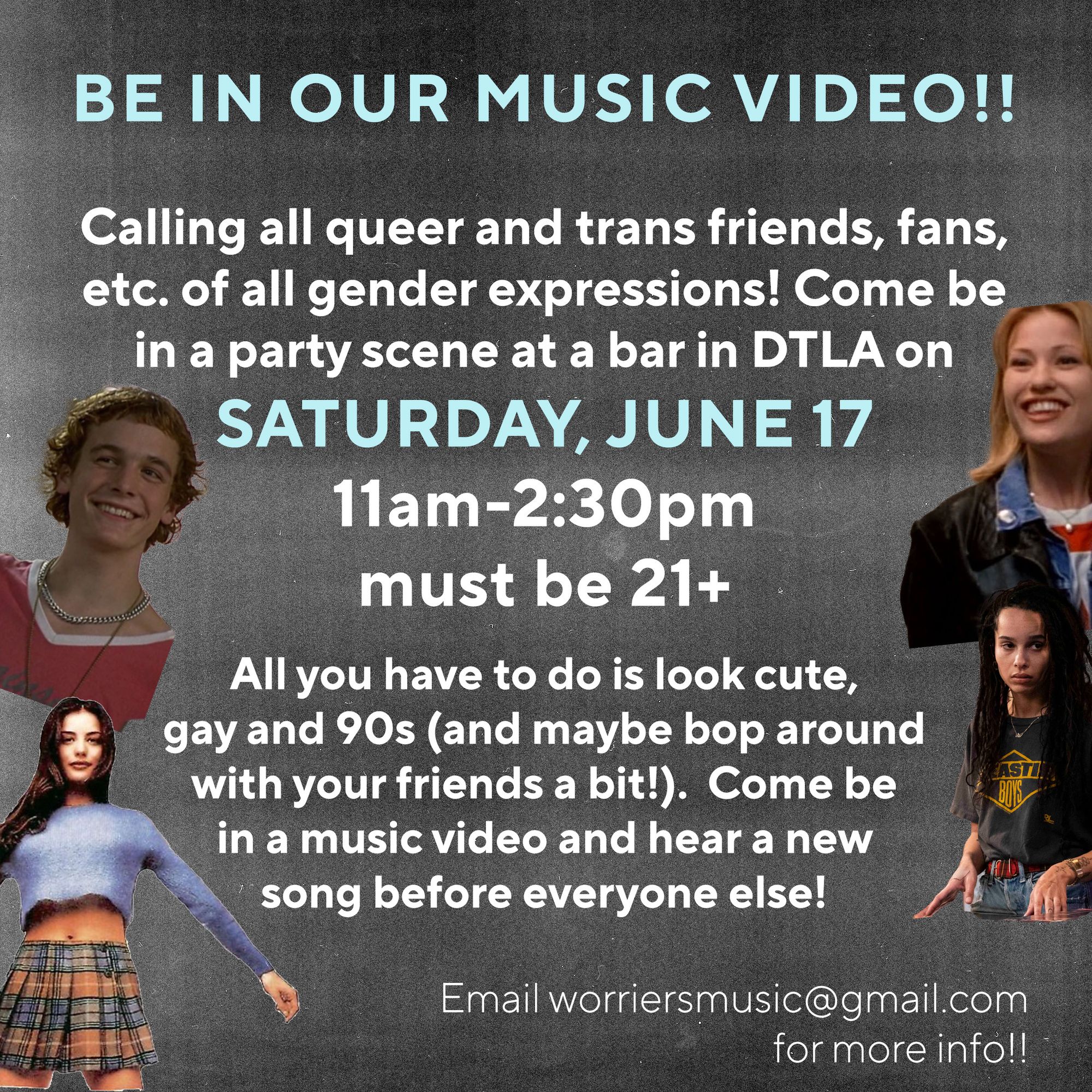 On June 17th we'll be shooting a music video in DTLA and we need folks to hang out at a party scene. I'm looking specifically for queer and trans folks of all gender expressions to be a part of it. If you're available roughly 11am-2:30pm, please email me at worriersmusic@gmail.com for more info! The theme is gay 90s movies so it's an opportunity to dress in your best grunge vibe or like you went on a dEliA's shopping spree just in time to go to Lillith Fair.