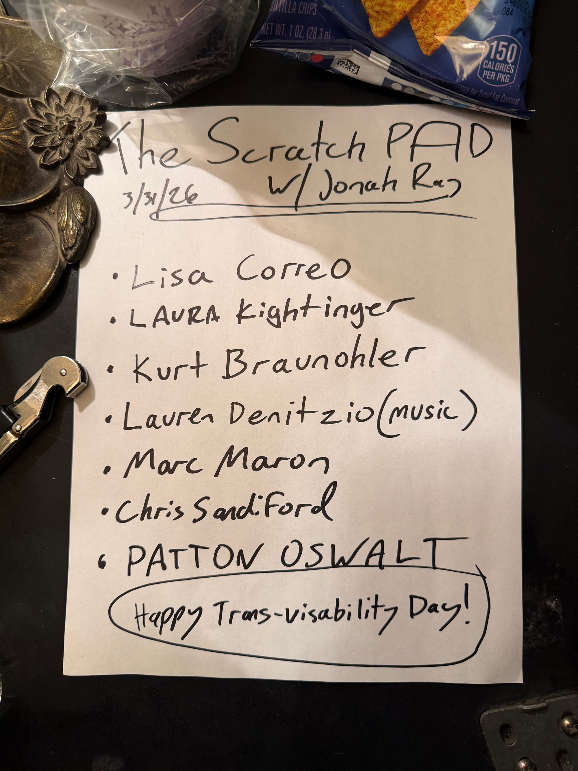 A few weeks ago I played a couple songs at Jonah Ray's Scratch Pad comedy night in Los Angeles. I was prepared for a solid lineup including headliner Patton Oswalt (more on that in a sec) but then Marc Maron and Kumail Nanjiani ALSO walked in, causing time and space to no longer operate as I thought they did.