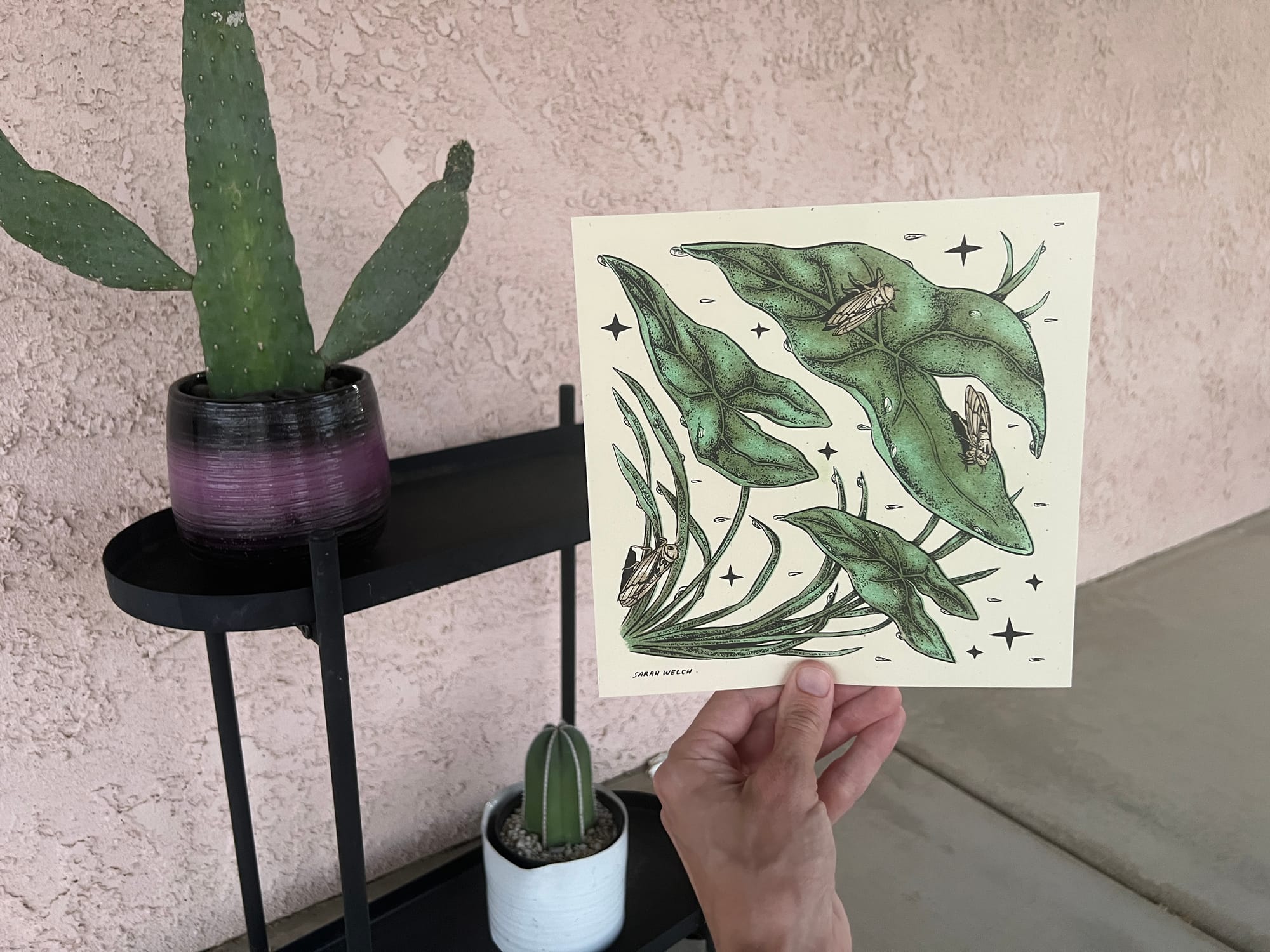 Another zine fest find was artist Sarah Welch, half of printmaking duo Mystic Multiples. Inspired by life on the Gulf Coast and decidedly the color green, her illustrations combine plant life, narrative art, and tarot themes. I'm always in the market for good risograph prints and was drawn to one with cicadas and leaves of an elephant ear plant. Her work is the kind where I just wanted to buy one of each.