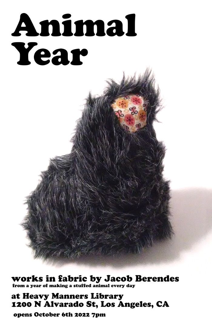 Jacob Berendes is an artist, writer, newspaper publisher, newsletter maker and rad person I've known for quite a while from my time in Providence, RI. This week I lucked out and get to see him out on the West Coast for the presentation of his exhibition Animal Year. It's the product of a year-long project where he made a stuffed animal every day for a year. They're weird and fun and don't always look like typical stuffed animals. The opening is tomorrow night, October 6, at Heavy Manners Library in Echo Park.