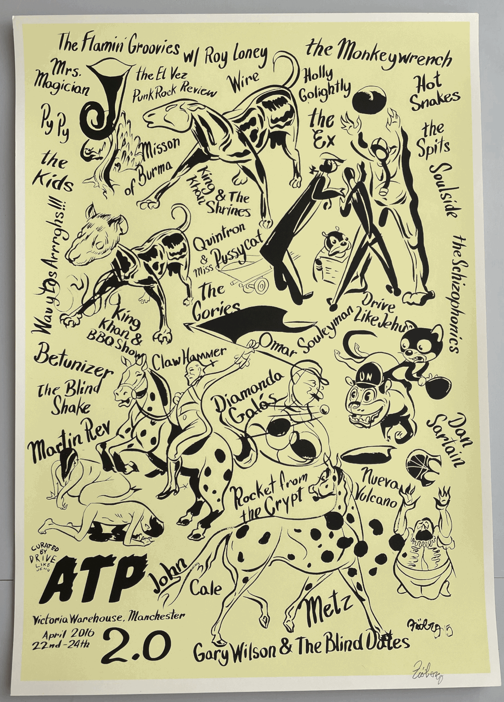 Combining fine art and illustration, making album covers while pursuing his own strange drippy style, he matched his visual work to the slightly off-kilter guitars in all of his bands. Somewhere between traditional pen and ink illustrations and surrealist scribbling, his artwork could sit in a gallery just as easily as on a record cover.