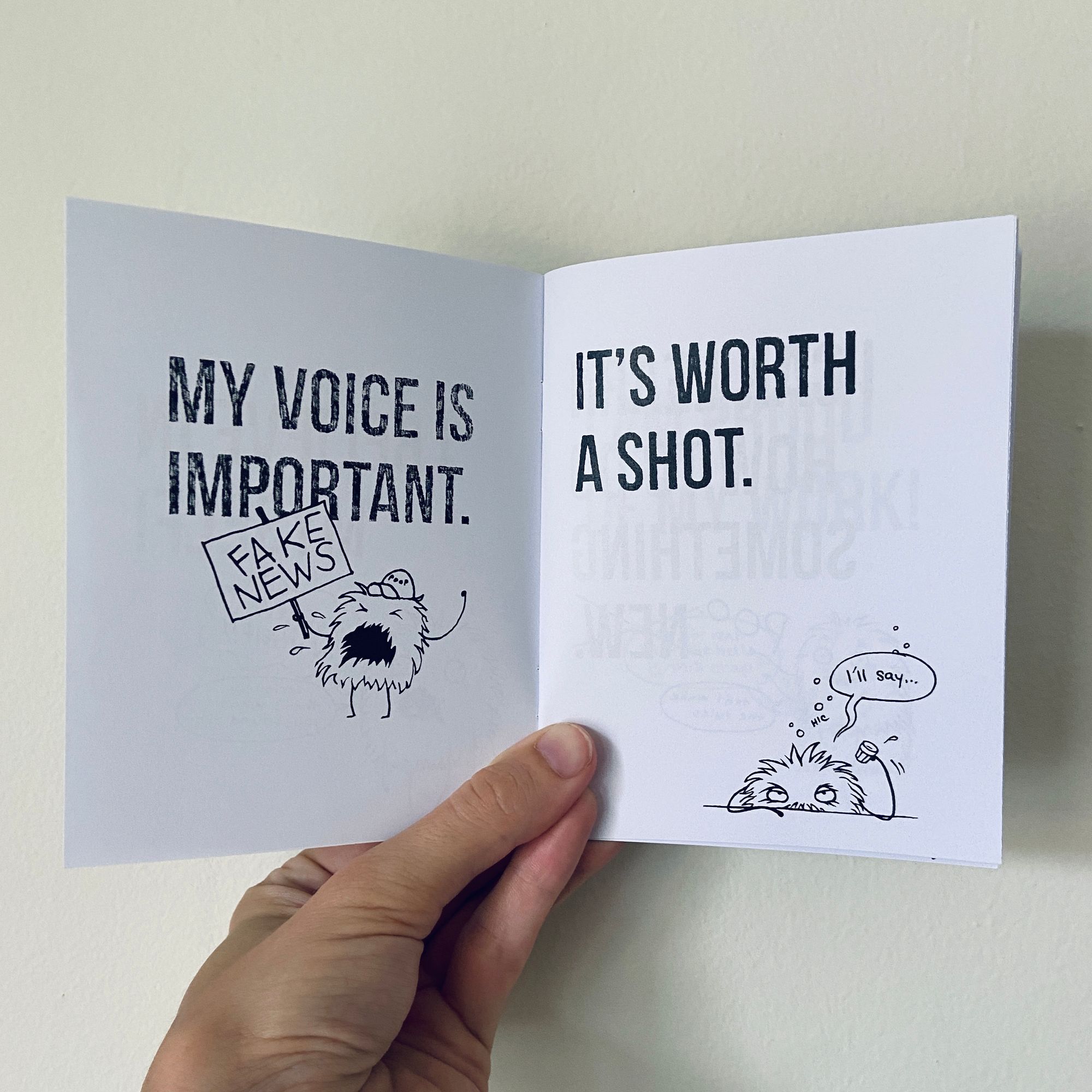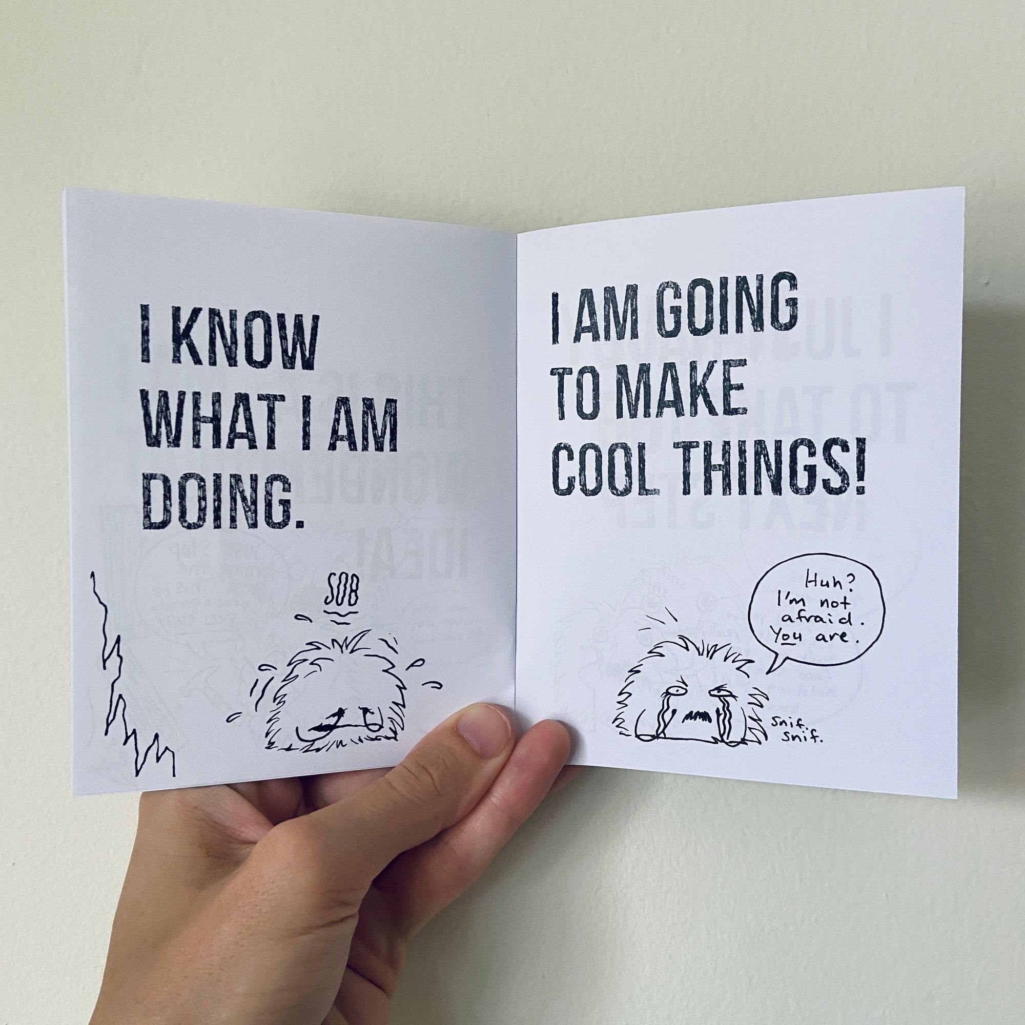 Cassia and I have been working on this mini-comic-zine called You Can Do It for a few months now, originally sketched up at Helen Jo’s zine workshop back when you could have an in-person zine workshop. Our idea was that I would draw motivational phrases and Cassia would draw a little inner-critic monster who would respond to each of them with something discouraging and mean. We wanted to use the format to show how ridiculous and baseless that inner voice is so much of the time and illustrate how to work through fear and doubt.